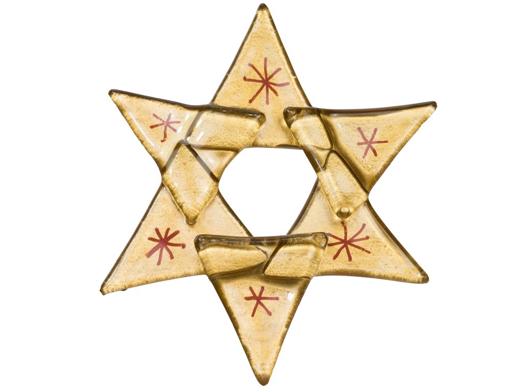 Oryginalna bożonarodzeniowa ozdoba ze szkła w kształcie złotej gwiazdy ze czerwonym wzorem w gwiazdki. Szklana gwiazda nadaje się również jako mały prezent. Szklane ozdoby świąteczne zapakowane są w ozdobne pudełko. Szklane ozdoby wykonywane są ręcznie, a każdy egzemplarz jest oryginalny. Szklane ozdoby dostarczane są w ozdobnym pudełku.