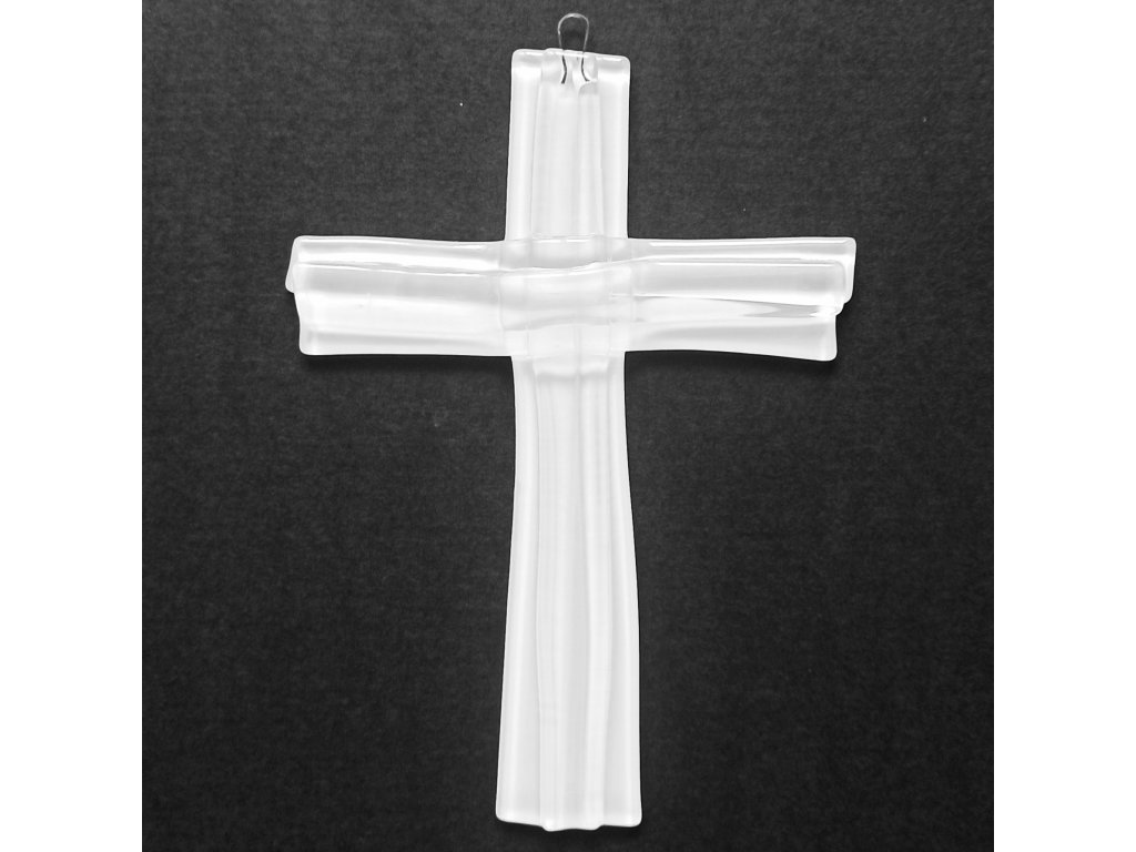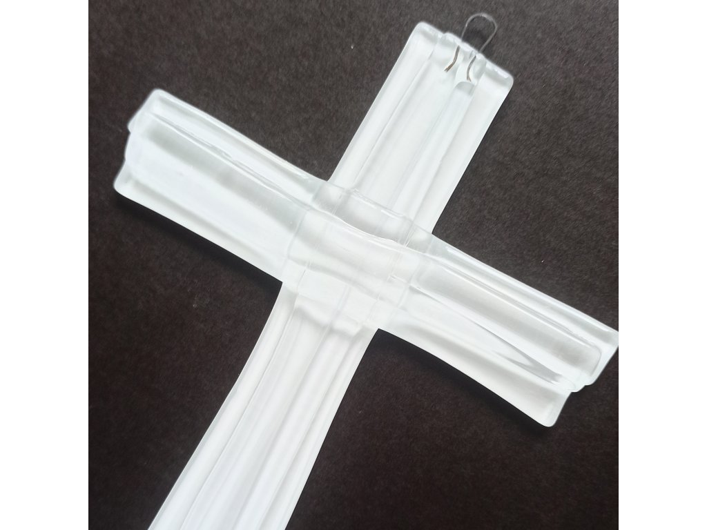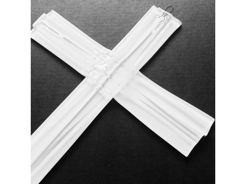 Krzyż powstaje w pracowni WAGA poprzez ręczne formowanie i łączenie warstw szkła. Dzięki technice szkła warstwowego powierzchnia zyskuje miękką, przestrzenną głębię, a światło przenika przez strukturę, tworząc subtelne, mleczne refleksy. Każdy egzemplarz jest unikatowy — drobne różnice w rozkładzie światła i fakturze świadczą o rzemieślniczym charakterze wykonania.