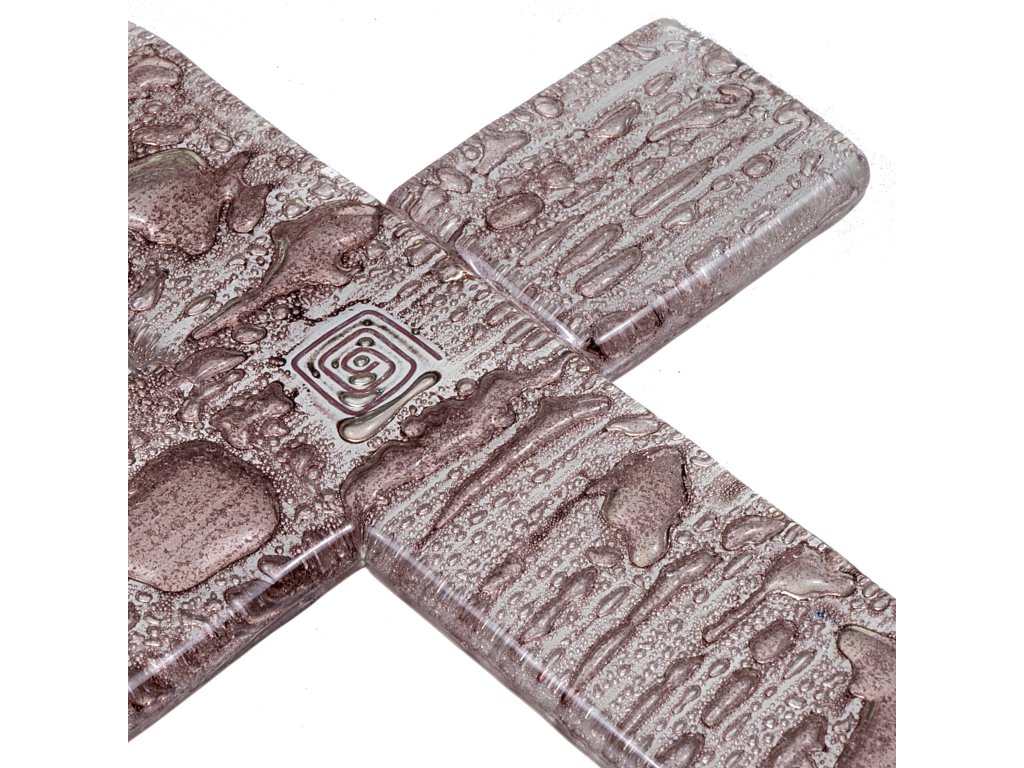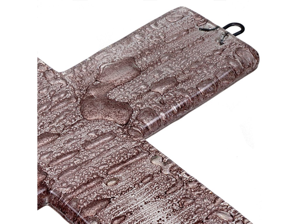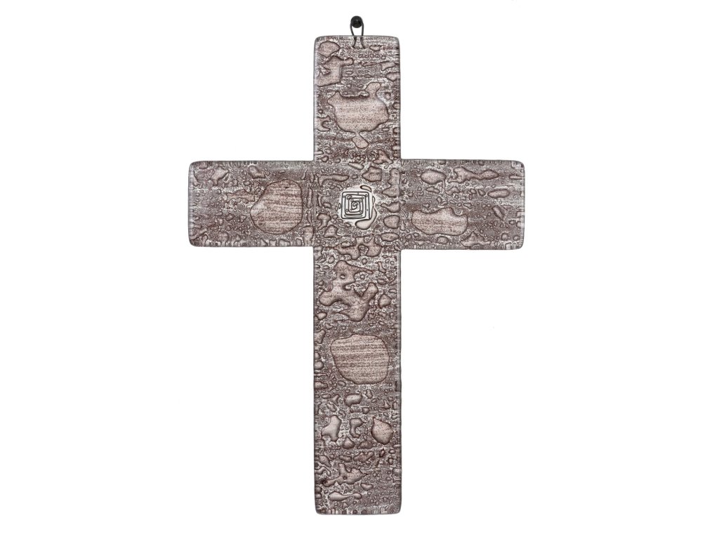 Ten krzyż powstaje w pracowni WAGA dzięki ręcznej obróbce barwionego szkła — szkło przybiera ciepły, ziemisty brąz, z bogactwem drobnych bąbelków powietrza o różnych rozmiarach i kształtach, co daje wyjątkową głębię i charakter każdemu egzemplarzowi.