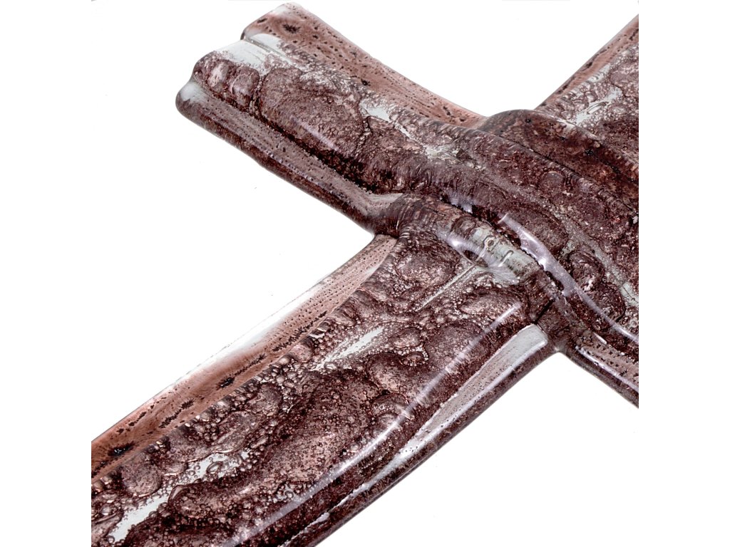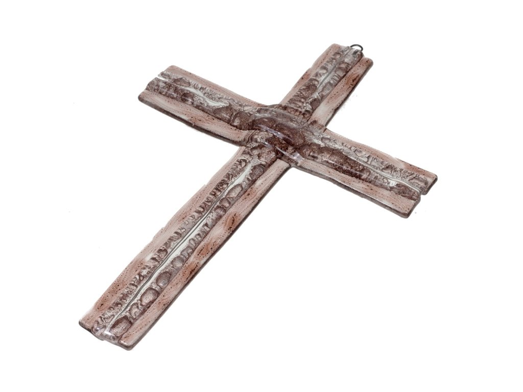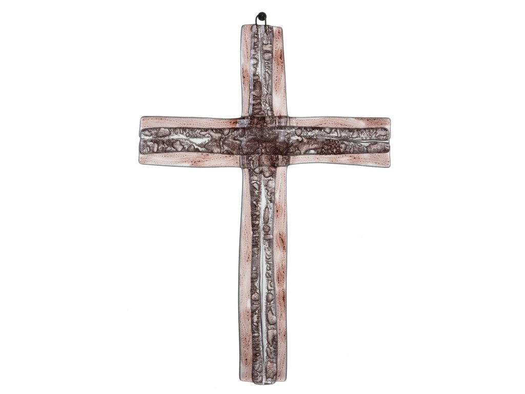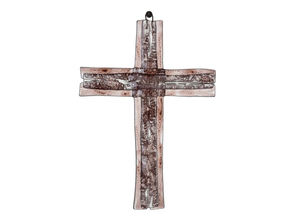 Ręcznie wykonany krzyż ścienny z warstwowego szkła w ciepłym, ziemistym odcieniu brązu — każda sztuka ma swój unikalny układ bąbelków powietrza. To delikatna i subtelna dekoracja, która nobilituje wnętrze domowej kapliczki lub pokoju modlitewnego.