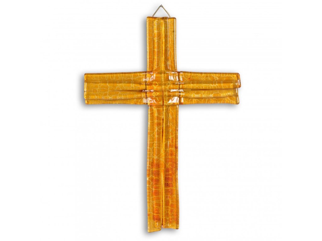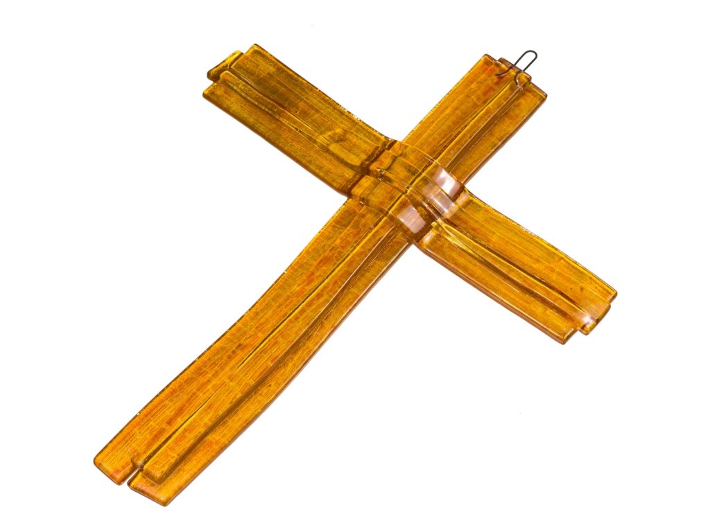 Ręcznie wykonany szklany krzyż ścienny w ciepłym, bursztynowym, złocistym odcieniu. Każdy egzemplarz jest unikatowy — dzięki ręcznej obróbce i warstwowej strukturze szkła — co czyni go elegancką, duchową dekoracją do domu lub kapliczki.