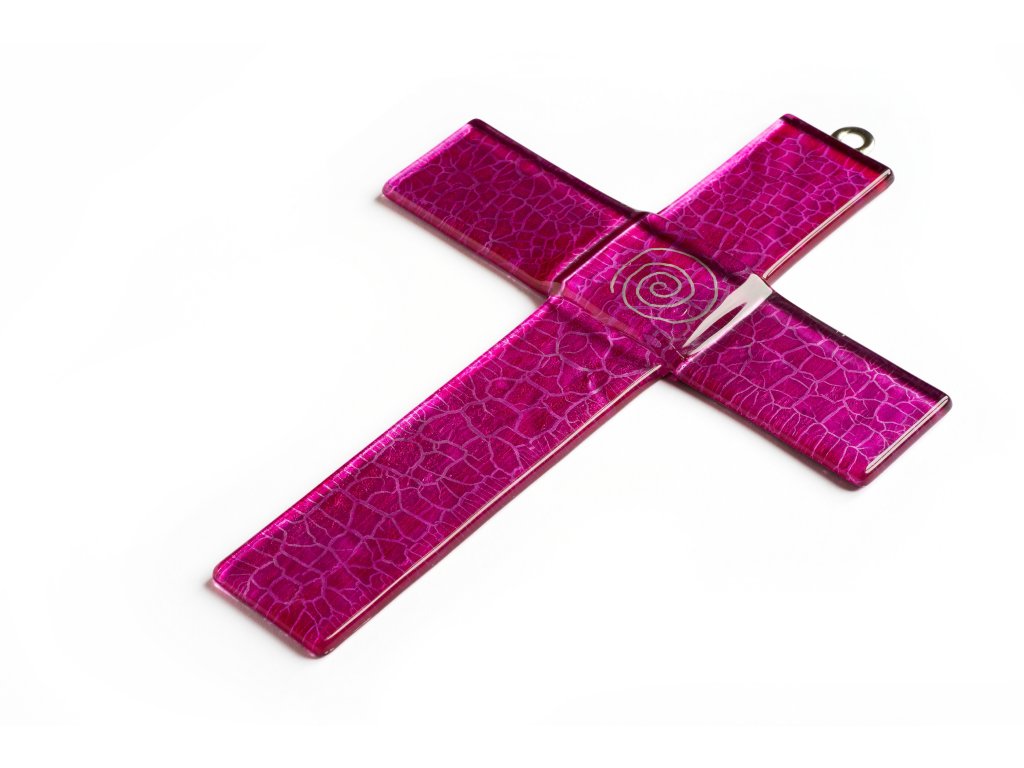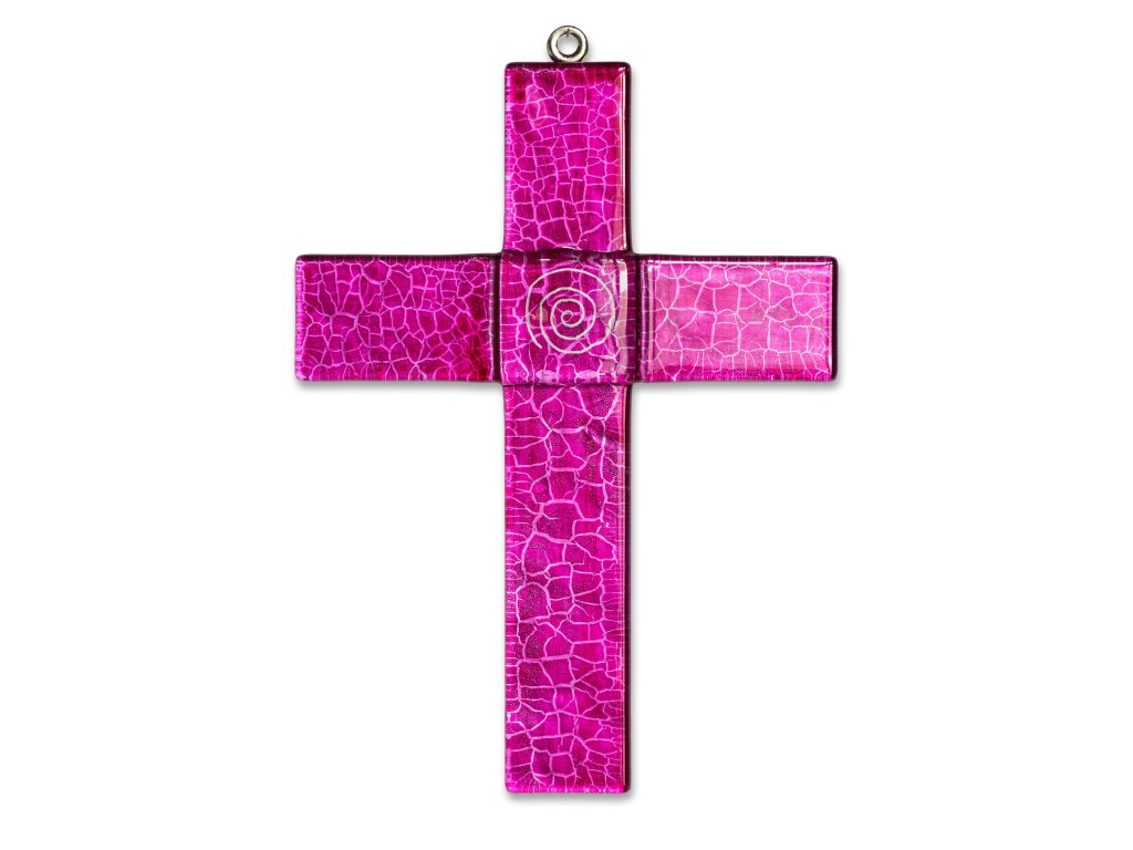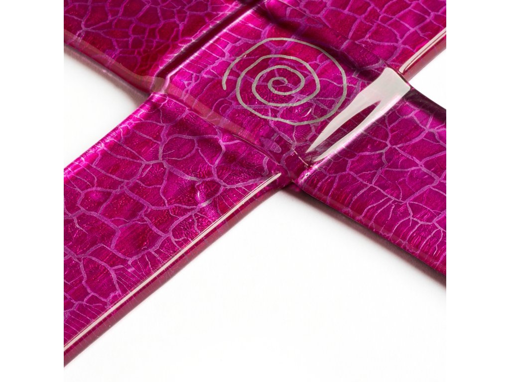 Szklany krzyż na ścianę głęboki różowy - ze spiralą
