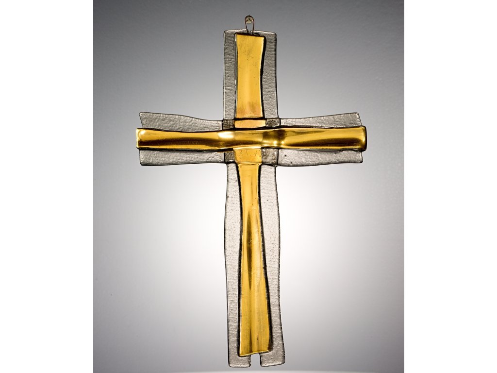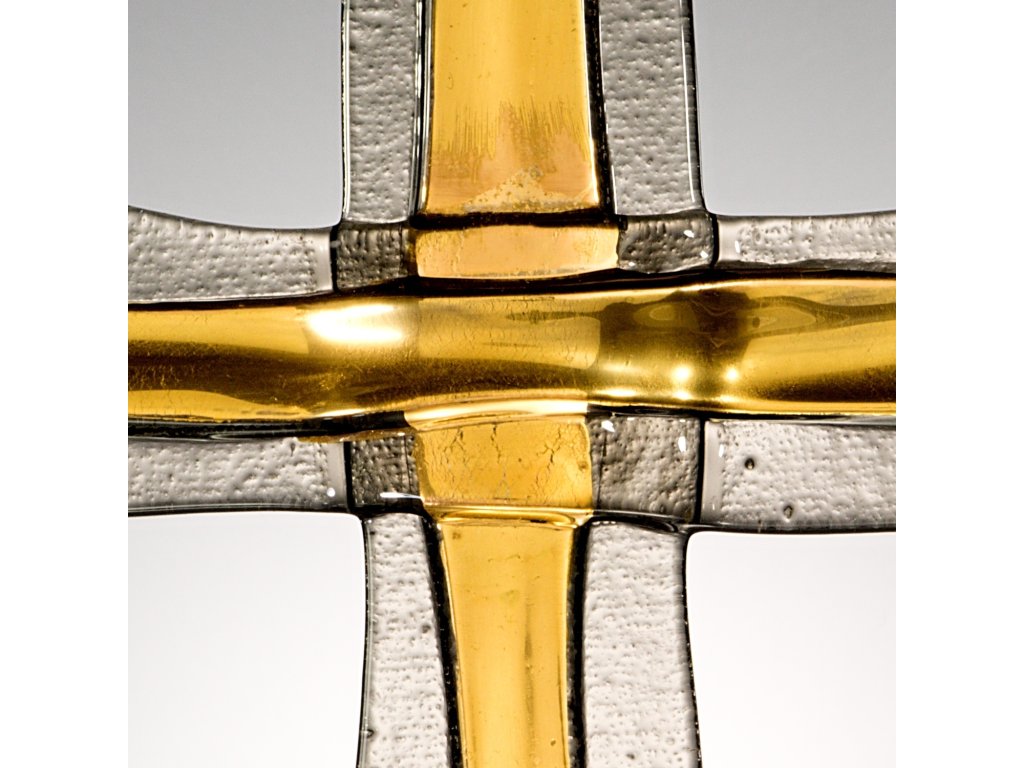 Szkło użyte do wykonania krzyża ma dymny, lekko przyciemniony odcień, co nadaje mu głębię i elegancję; środkowa część krzyża pokryta jest prawdziwym złotem.